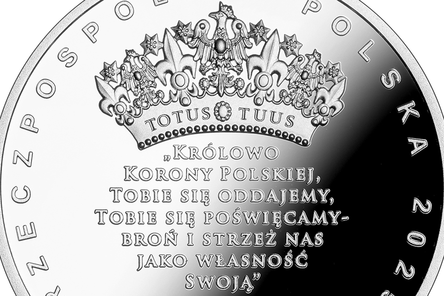 u góry wizerunek korony Maryi z obrazu Matki Bożej Jasnogórskiej, ofiarowanej przez Świętego Jana Pawła II, poniżej tekst o treści: „KRÓLOWO / KORONY POLSKIEJ, / TOBIE SIĘ ODDAJEMY, / TOBIE SIĘ POŚWIĘCAMY – / BROŃ I STRZEŻ NAS / JAKO WŁASNOŚĆ / SWOJĄ”, u dołu wizerunek orła ustalony dla godła Rzeczypospolitej Polskiej, pod orłem, po prawej stronie, znak mennicy: m / w oraz z prawej strony orła napis: 10 ZŁ. W otoku, od lewej strony ku górze, napis: RZECZPOSPOLITA POLSKA 2025.