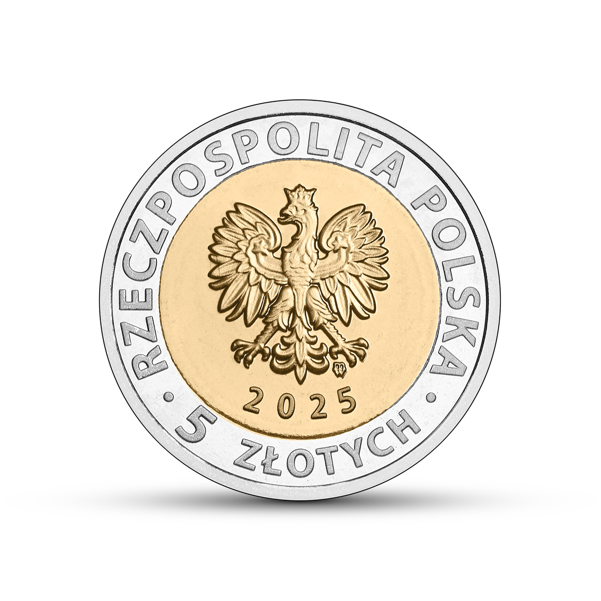 centralnie, na wyodrębnionej płaszczyźnie w kształcie koła, wizerunek orła ustalony dla godła Rzeczypospolitej Polskiej. Poniżej orła półkolem oznaczenie roku emisji: 2025. W otoku, u góry, półkolem napis: RZECZPOSPOLITA POLSKA oraz u dołu półkolem napis: 5 ZŁOTYCH, poprzedzony oraz zakończony perełką. Pod orłem, po prawej stronie, znak mennicy: m / w.