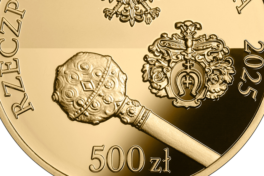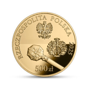 Centralnie stylizowany grot włóczni św. Maurycego, z lewej strony wizerunek orła ustalony dla godła Rzeczypospolitej Polskiej, pod orłem, po prawej stronie, znak mennicy: m / w; z prawej strony włóczni napis: 500 / ZŁ, w tle wieniec z ornamentu. U dołu rewers denara Princes Polonie, z lewej i prawej strony w rogach powtarzający się ornament. U góry, wzdłuż brzegu, napis: RZECZPOSPOLITA POLSKA 2025.