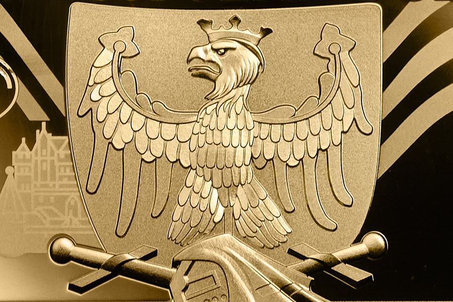 w środkowej części stylizowany wizerunek tarczy z orłem z nagrobka króla Władysława II Jagiełły, u jej podnóża hełm i płaszcz krzyżacki oraz dwa miecze. Z lewej strony tarczy zarys Zamku Krzyżackiego w Malborku, powyżej owal z fragmentami korony. U góry, na tle wstęg, napis: RZECZPOSPOLITA POLSKA oraz z prawej strony oznaczenie roku emisji: 2026. U dołu, na tle prostokątnej płaszczyzny z ornamentem, z lewej strony liczba: 100, z prawej strony napis: STO / ZŁOTYCH. W prawym dolnym rogu litery: NBP. Powyżej wizerunek orła ustalony dla godła Rzeczypospolitej Polskiej, pod orłem, po prawej stronie, znak mennicy: m / w, po lewej stronie napis: Au 999,9.