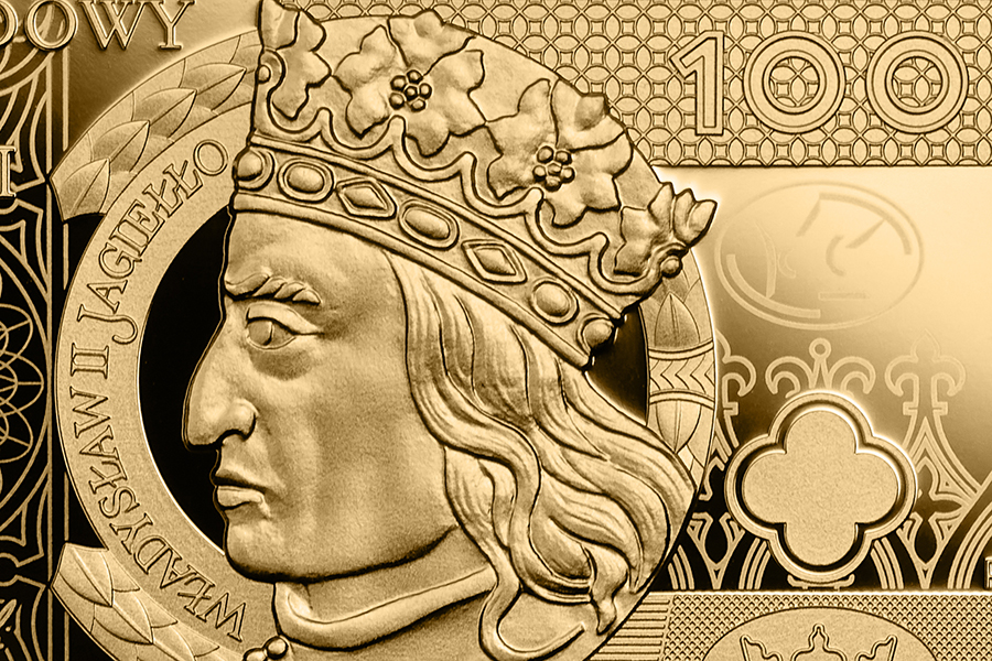 w środkowej części, w ozdobnym medalionie, portret króla Władysława II Jagiełły, z lewej strony portretu, półkolem, napis: WŁADYSŁAW II JAGIEŁŁO. Z lewej strony medalionu, u góry napis: NARODOWY / BANK / POLSKI, u dołu napis: WARSZAWA / 14 GRUDNIA 2018 r., poniżej napisy: PREZES i podpis oraz GŁÓWNY / SKARBNIK i podpis. W tle napisów ozdobna rozeta i stylizowane elementy ornamentyki gotyckiej. W lewym górnym rogu, pionowo, ułożona z cyfr pod kątem 90° liczba: 100. Z prawej strony liczby pionowa linia, wzdłuż linii z prawej strony, pionowo, ułożony z liter pod kątem 90° napis: STO ZŁOTYCH. W lewym dolnym rogu równoramienny krzyż. Z prawej strony u góry, na tle wyodrębnionej płaszczyzny z ornamentem, liczba: 100. Poniżej płaszczyzny owal z fragmentami korony, pod nim, na tle ornamentu gotyckiego, rozeta; u dołu wyodrębniona płaszczyzna z ornamentem i koroną w owalu.