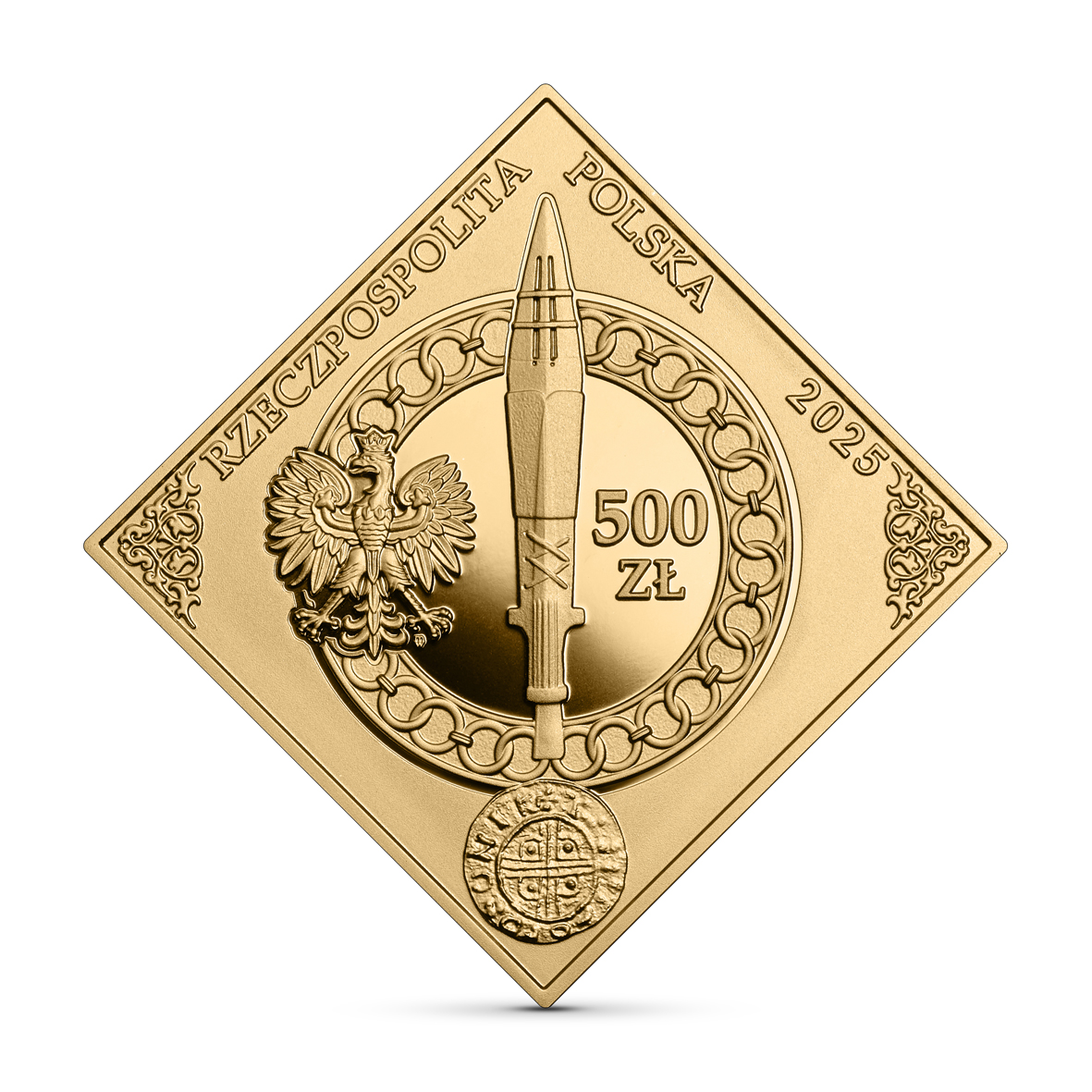 Centrally, a stylised tip of the Lance of Saint Maurice; on the left, an image of the Eagle established as the state emblem of the Republic of Poland; below the Eagle, on the right, the Mint mark: m / w; to the right of the lance, the inscription: 500 / ZŁ; an ornamental wreath in the background. At the bottom, the reverse of a Princes Polonie denarius; in the corners on the left and right, a repeated ornament. At the top, along the rim, the inscription: RZECZPOSPOLITA POLSKA (Republic of Poland) 2025.