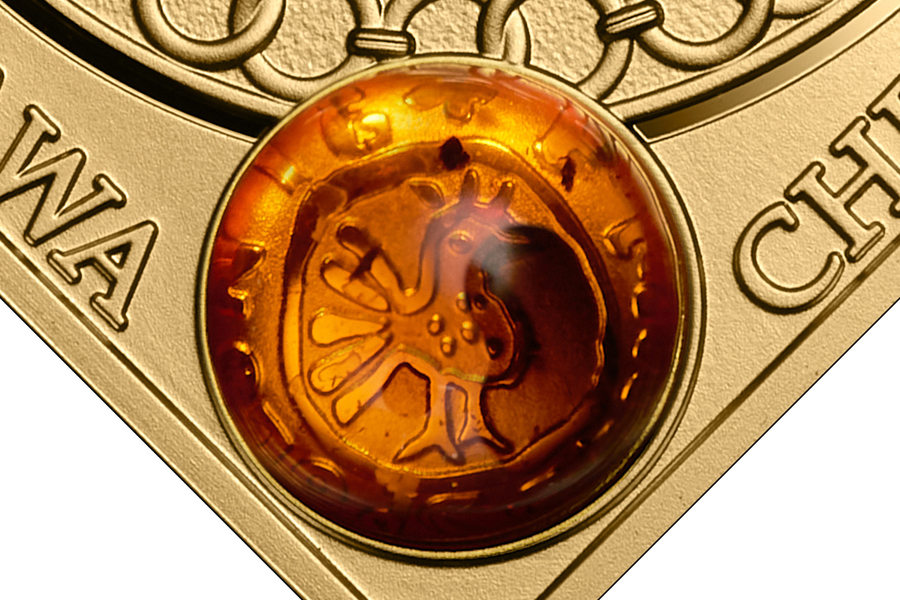 Centrally, the bust of Boleslaus the Brave according to an 18th-century medal by Jan Filip Holzhaeusser, surrounded by an ornamental wreath. At the bottom, the obverse of a Princes Polonie denarius, covered by an amber element. Along the rim, the inscription: TYSIĄCLECIE KORONACJI BOLESŁAWA CHROBREGO (1000th Anniversary of the Coronation of Boleslaus the Brave). A repeated ornament in three corners.