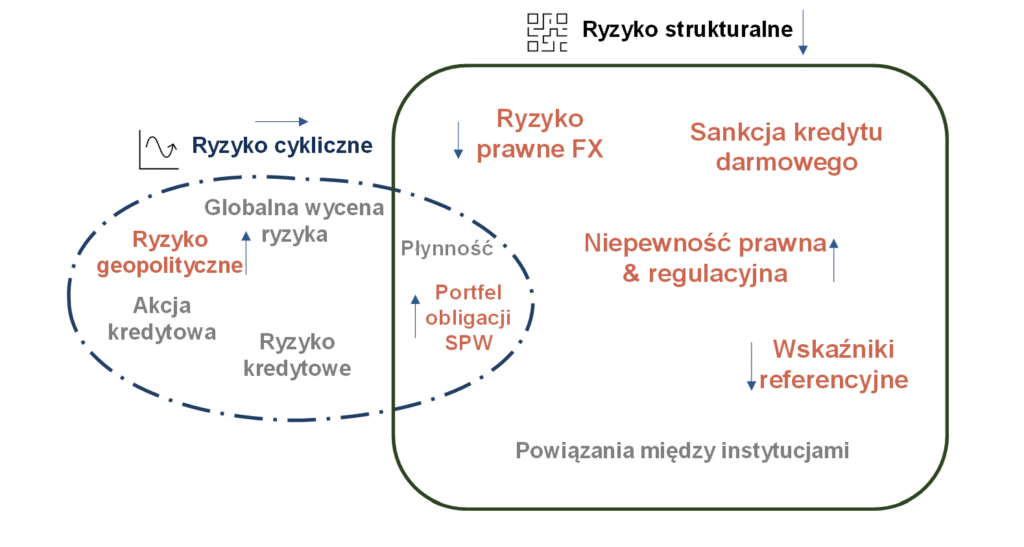 Kluczowe wyzwania dla stabilności finansowej nie zmieniły się istotnie od ostatniej edycji Raportu i związane są przede wszystkim z niepewnością środowiska prawnego, która przejawia się w dwóch wymiarach. Pierwszy dotyczy kosztów ryzyka prawnego – ujawniły się nowe ryzyka związane z wykładnią przepisów o ochronie konsumenta w kredytach złotowych. Drugi dotyczy ograniczonej przewidywalności regulacji krajowych, która utrudnia planowanie działalności w dłuższym okresie.